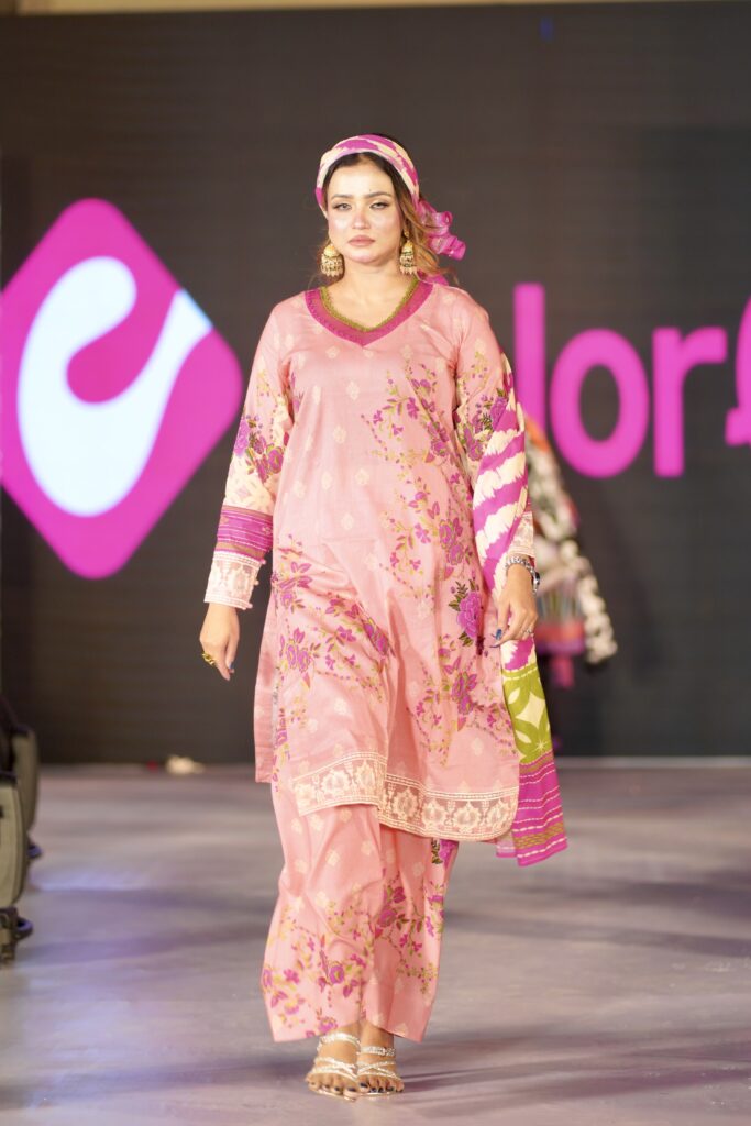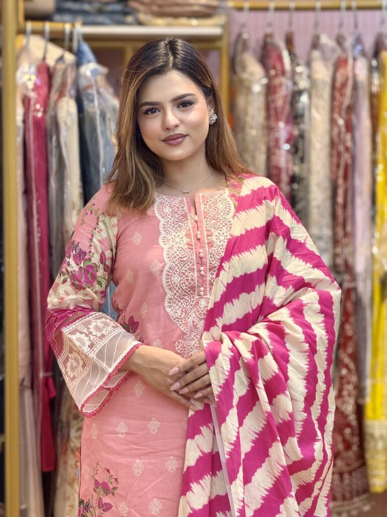 কামিজ – ফ্রন্ট ও স্লিভসে ফুলেল ডিজাইনের প্রিন্ট, বডিতে হালকা গোলাপি রঙের সলিড প্যানেল ও গলায় সাদা এম্ব্রয়ডারি সেলাইয়ের কাজ।