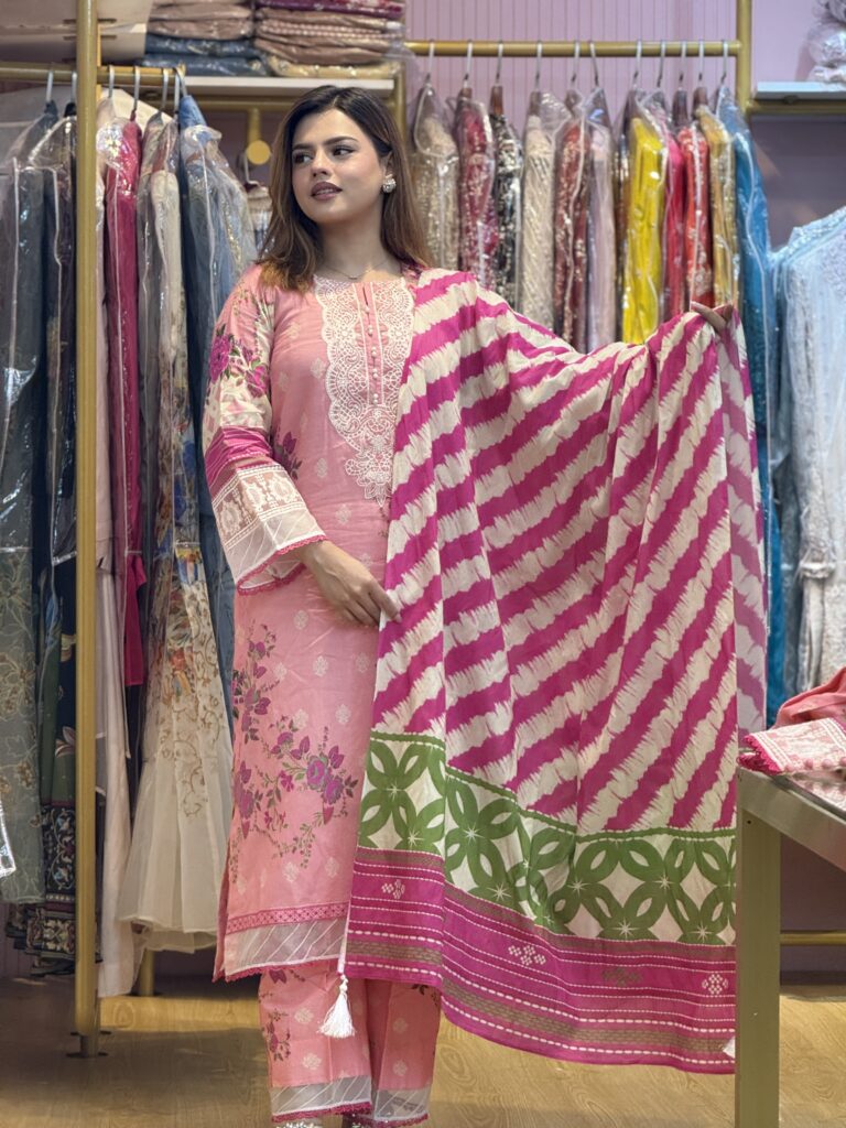 সালোয়ার – ম্যাচিং ফ্যাব্রিকে তৈরি, নিচের প্রান্তে সাদা – গোলাপি লেইস ডিটেইলিং