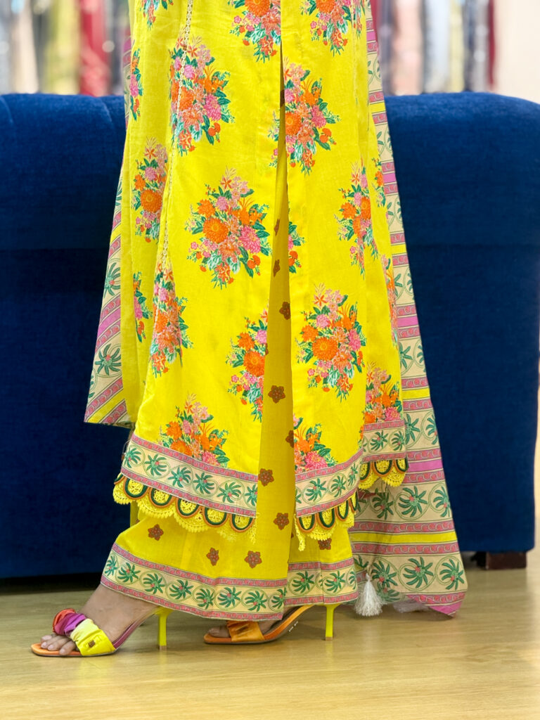 🟠 সালোয়ার/বটম – ম্যাচিং ইয়েলো বেস। নিচে প্রিন্টেড হেম বর্ডার + ছোট ছোট ফুলের মোটিফ। কামিজের হেম ডিজাইনের সাথে পুরোপুরি match করে।