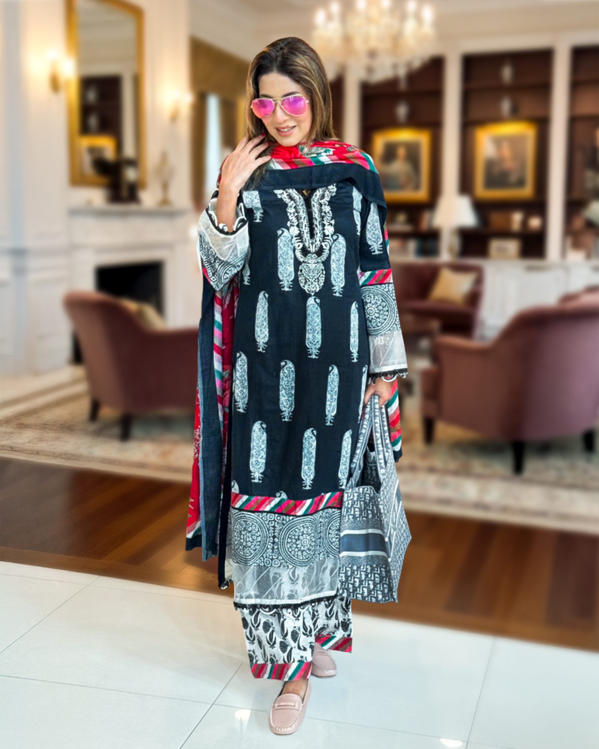 🟠 কামিজ – ডিপ ব্ল্যাক কালারের উপর অফ-হোয়াইট ট্র্যাডিশনাল মোটিফ প্রিন্ট। হাই কোয়ালিটি সফট প্রিন্টেড কটন ফেব্রিকে তৈরি, যা পরতে আরামদায়ক ও breathable। বটম ও হাতায় কনট্রাস্ট প্রিন্টেড বর্ডার যুক্ত।
