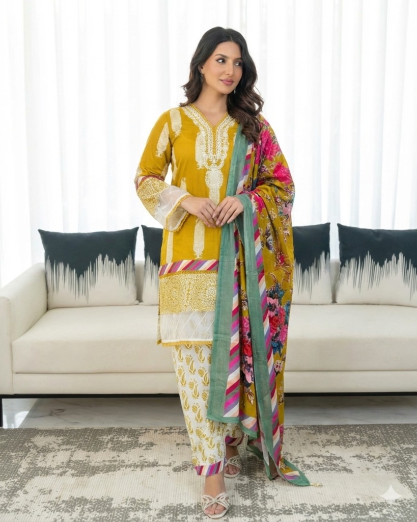🟠 সালোয়ার / বটম – অফ-হোয়াইট বেসের উপর ক্লাসিক Mustard Kolka print। সফট ও আরামদায়ক কটন ফ্যাব্রিকে তৈরি, যা পরতে হালকা ও breathable।