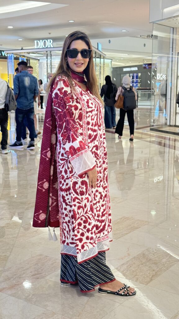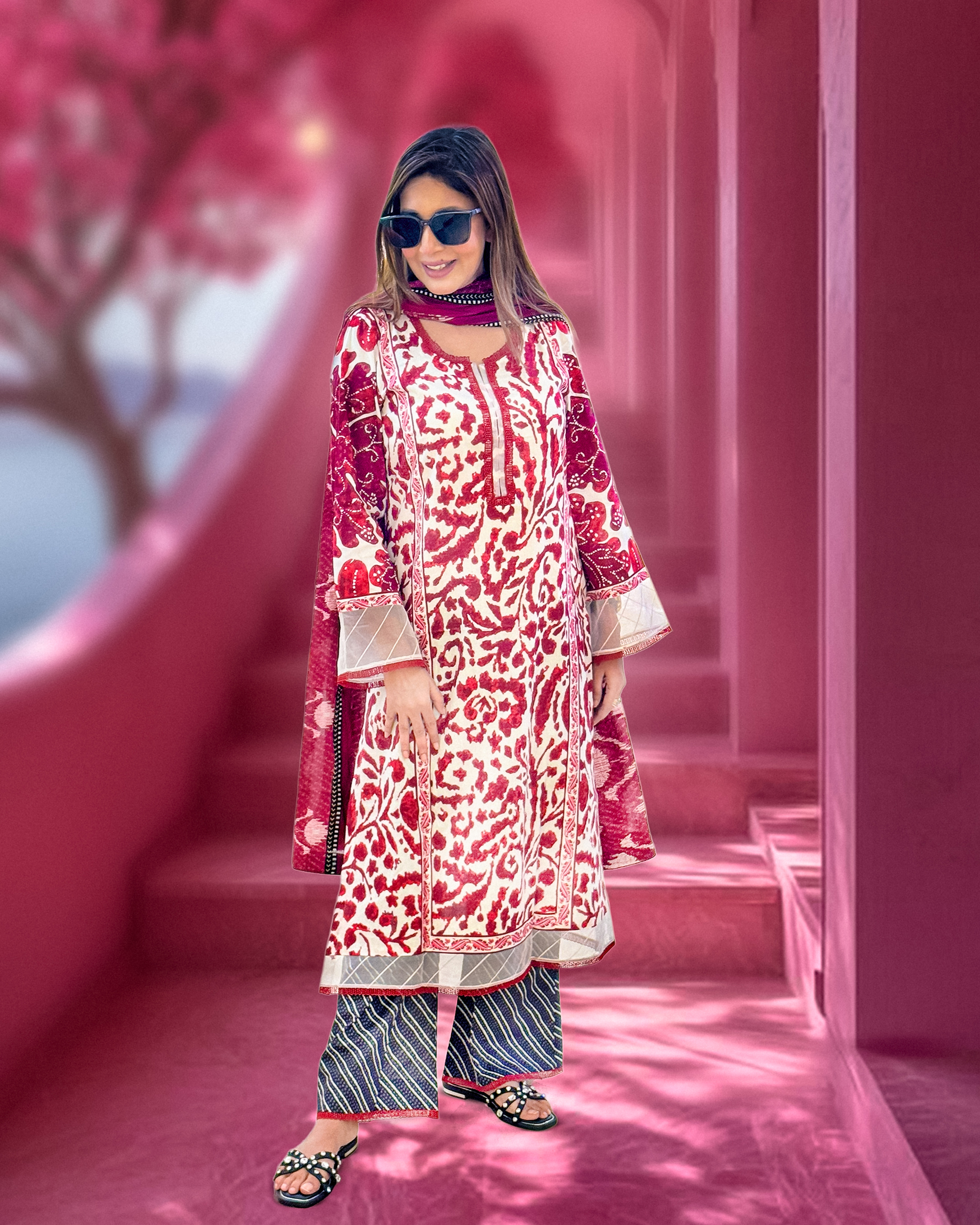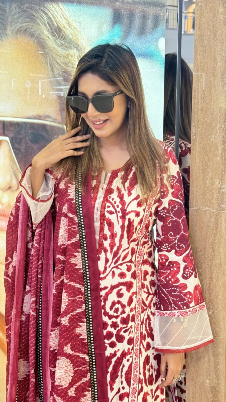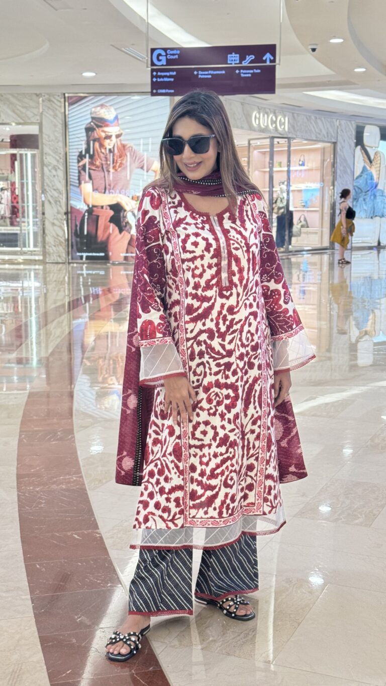 কামিজ – ফ্রন্ট ও স্লিভসে প্রিন্ট বর্ডার, বডিতে মেরুন রঙের ফুলেল প্যানেল ও গলায় সাদা ও মেরুন লেইস সেলাইয়ের কাজ।