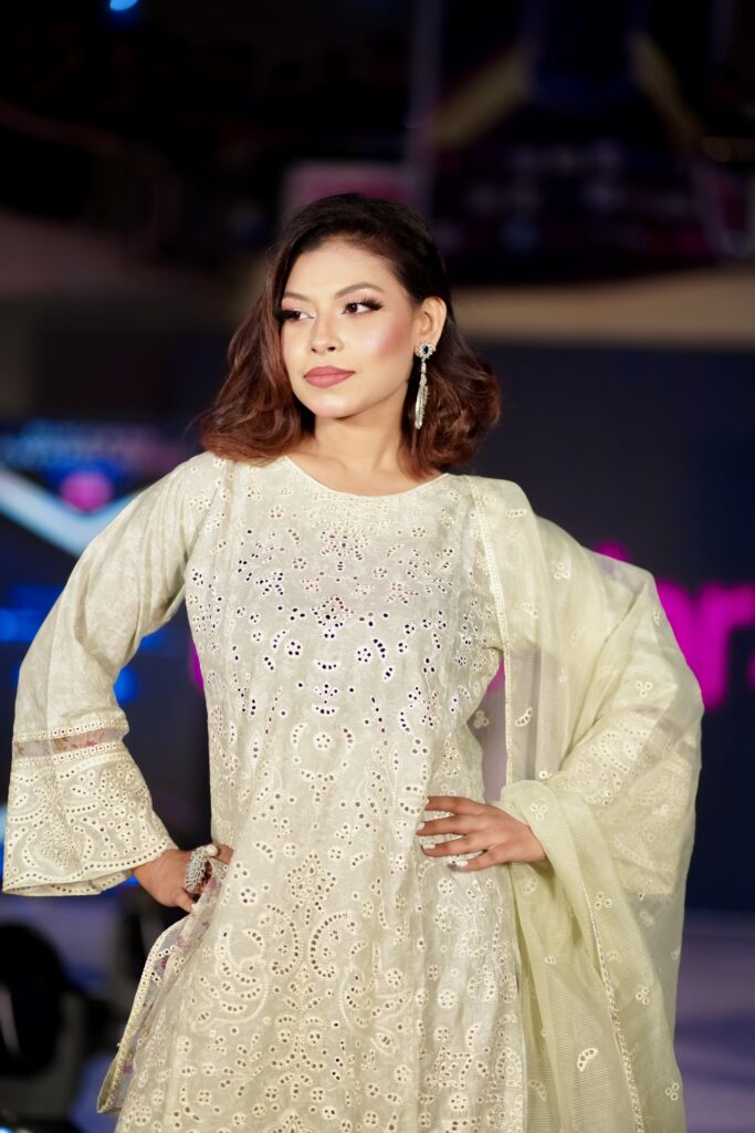 কামিজ – ফ্রন্ট ও স্লিভসে সাদা লেইস বর্ডার , বডিতে হালকা ন্যুড প্যানেল এর উপর চিকানকারি ফুলেল কন্ট্রাস্ট নকশা।
