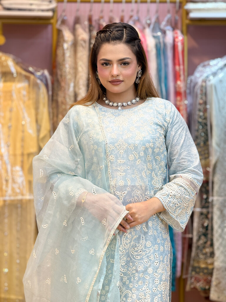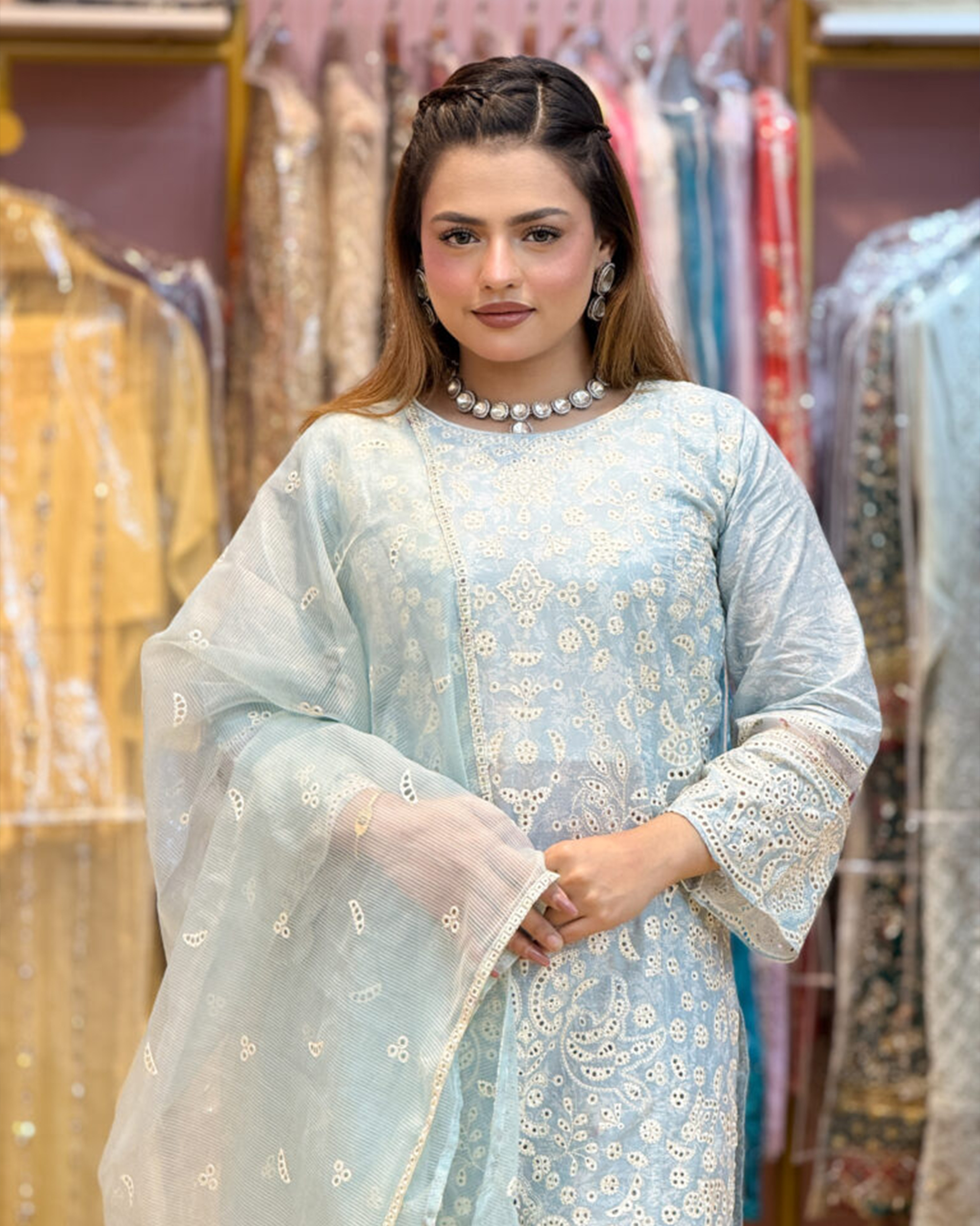 🟠 ওড়না – সফট কোটা ফ্যাব্রিকে, হালকা স্কাই রঙ এর উপর চিকানকারি ফুলেল কন্ট্রাস্ট নকশা।